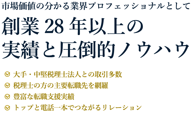 例えば、税理士に関していいますと過去1,000名超の支援実績があります。その成功パターンはノウハウとして弊社内で引き継がれており、あなたの経歴・実力を最も高く買ってくれる企業をご紹介可能です。
